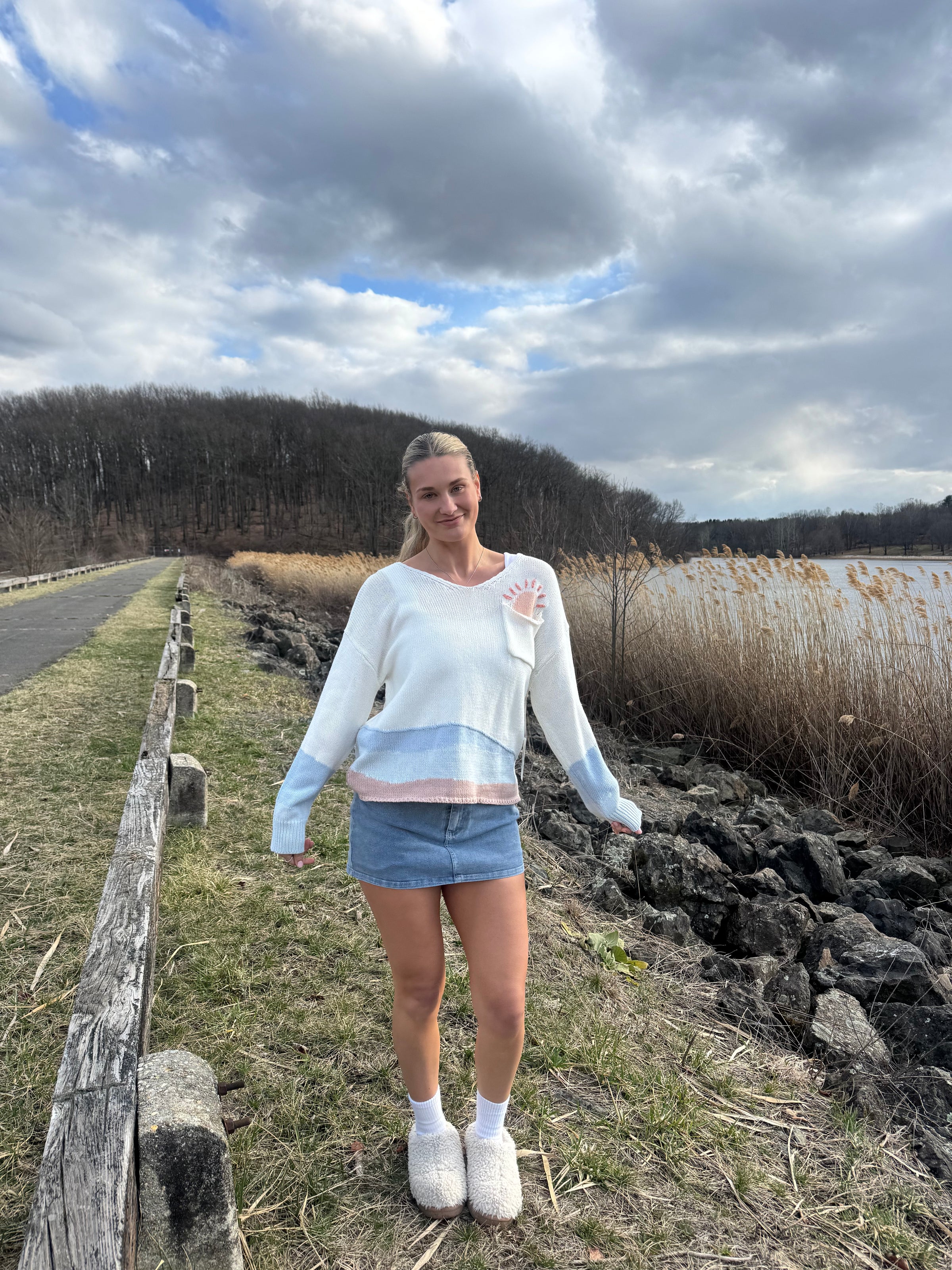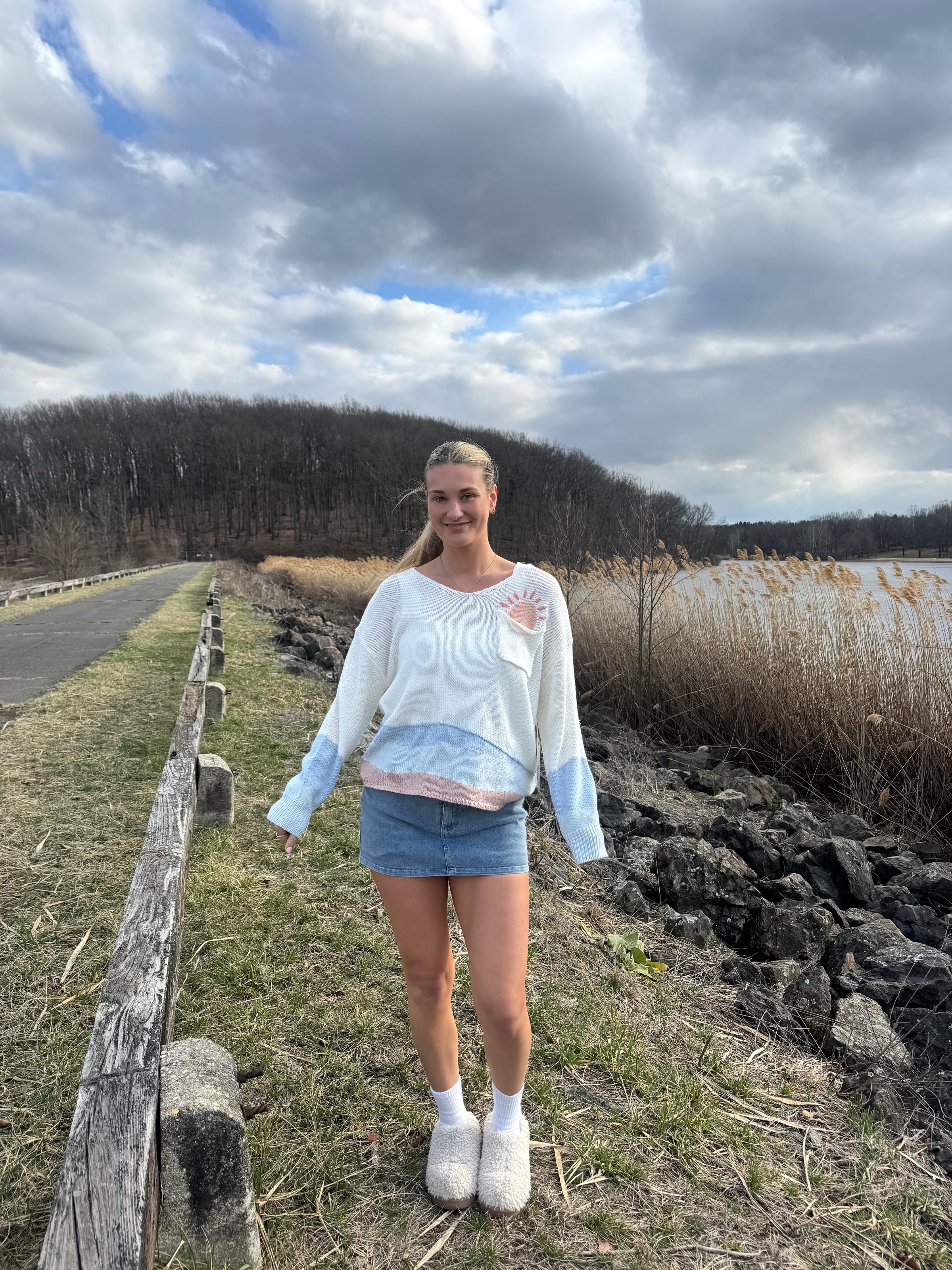 Channel your inner summer vibes with our Sunrise Sweater: a unique and detailed play on your average sweater. We are obsessed with the pocket sunrise detail and the cute wave in the back. Perfect for all the beach babes!